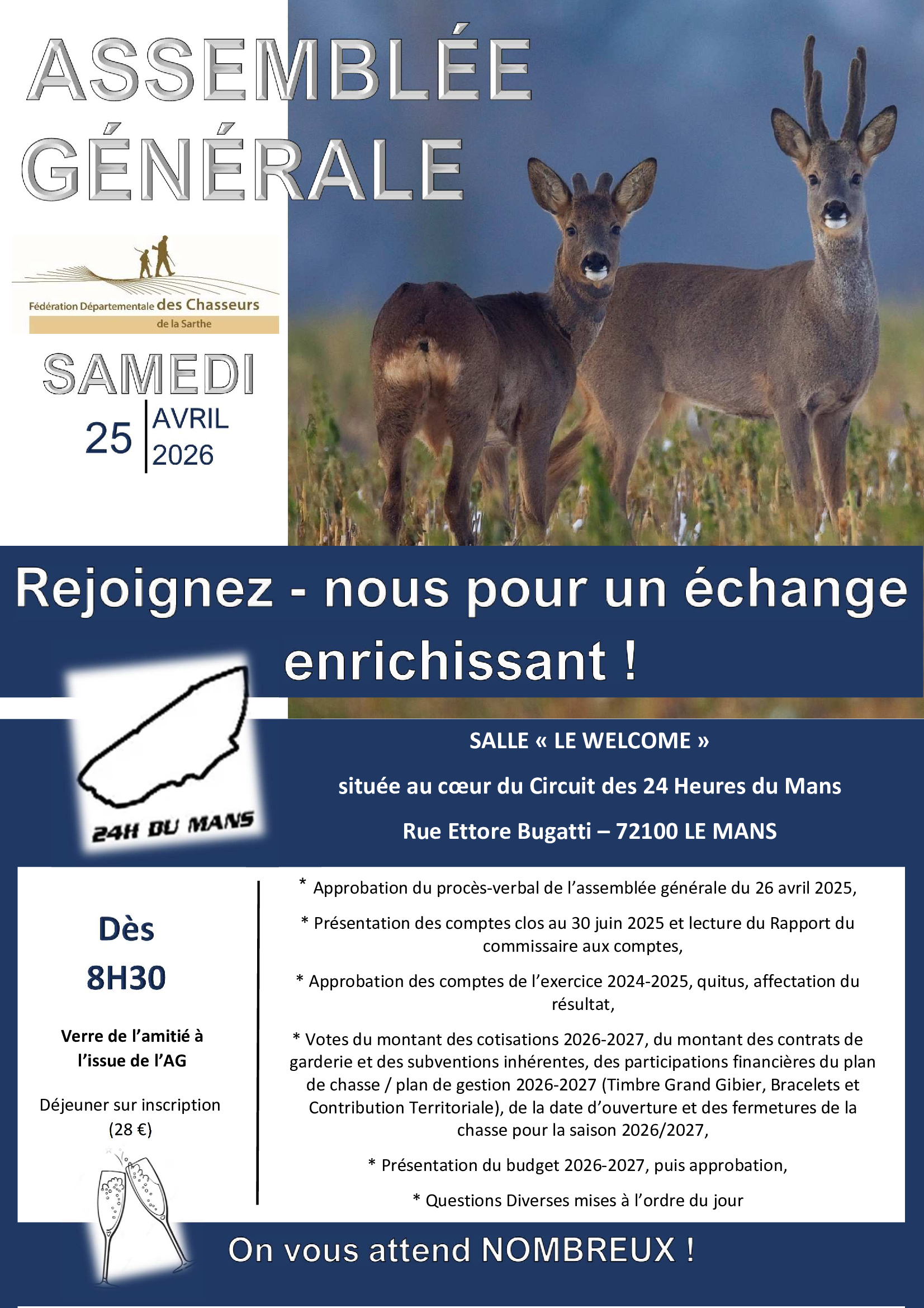 Un verre de l’amitié sera servi pour clôturer cette Assemblée, suivi d’un déjeuner (sur réservation auprès de la FDC 28 €).